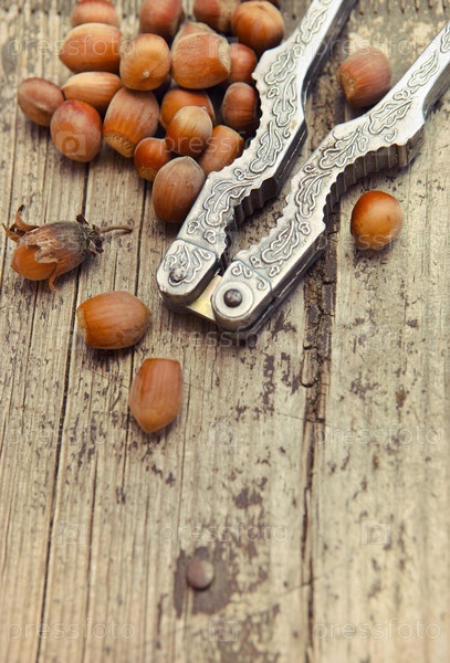 Орехи (фундук) на старом деревянном столе. Крупным планом