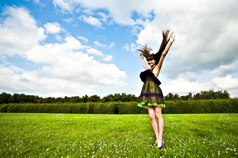 Красивая улыбающаяся девушка с длинными коричневыми волосами на зеленом лугу