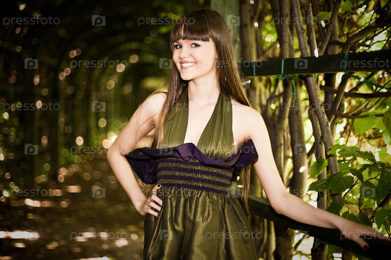 Красивая улыбающаяся девушка останавливается в коридоре деревьев с солнечными лучами