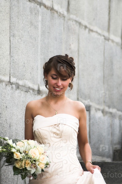 Невеста с букетом цветов спускается по лестнице