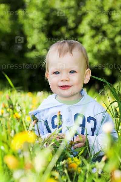 Веселый малыш сидит в поле из одуванчиков