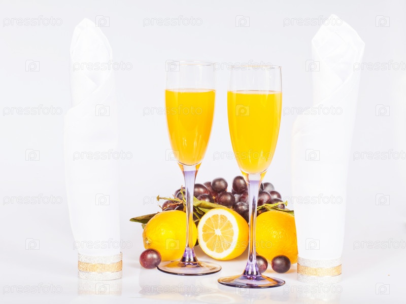 Лимон, бокалы с соком и виноград