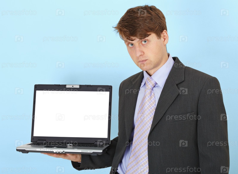 Бизнесмен держит на руках ноутбук на голубом фоне
