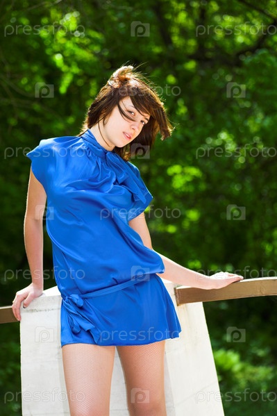 Хитрая девушка в синем платье на фоне листвы