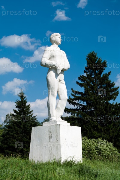 Белый памятник летчику в летнем парке на фоне неба с облаками