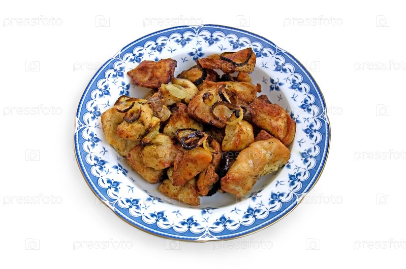 Кусочки жаренного мяса курицы в тарелке на белом фоне