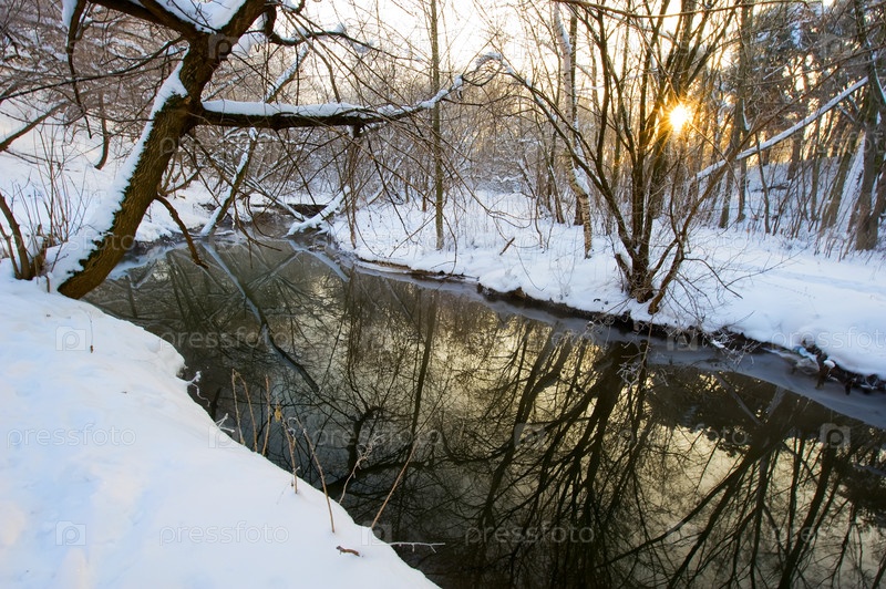 Не замерзший ручей среди снега