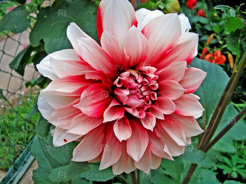 Бело-красный георгин на фоне сетчатого забора