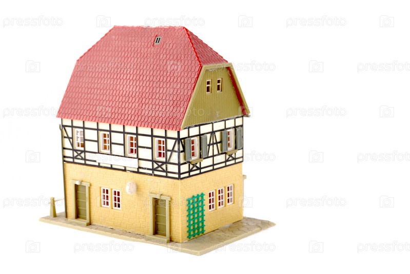 Желтый дом с красной крышей на белом фоне