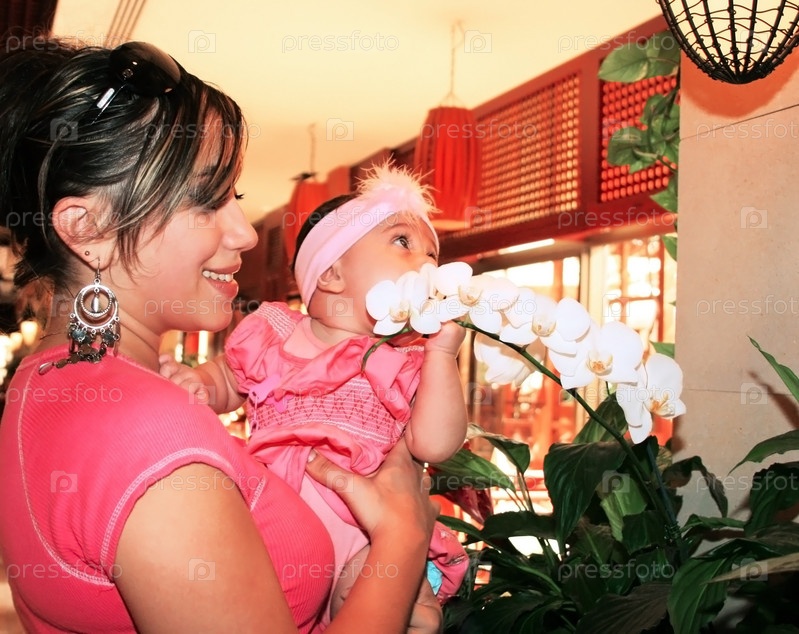 Мама с дочерью нюхают орхидею