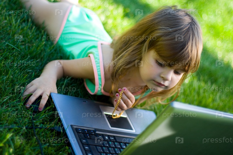 Ребенок с ноутбуком на траве