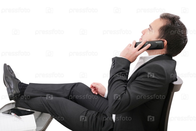 Молодой бизнесмен говорит по телефону, сидя у стола, изолированный на белом