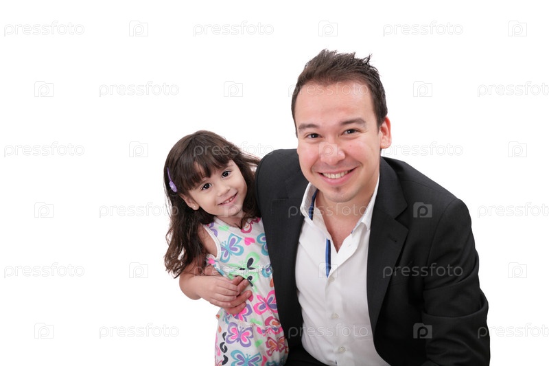 Отец и молодая дочь. Изолированные на белом фоне. Фокус на маленькой девочке