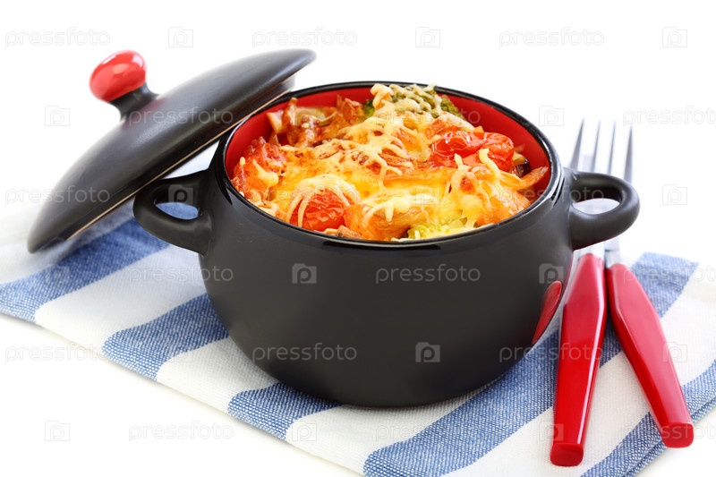 Черная кастрюля с соте из овощей и сыра