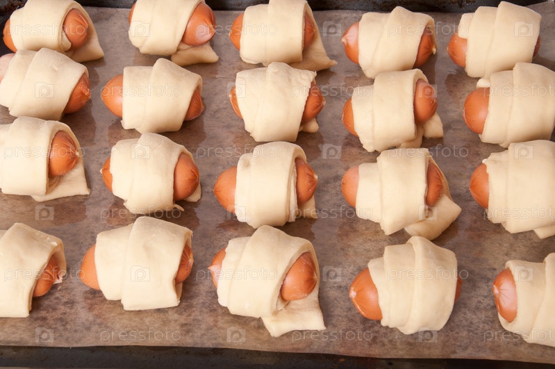 Колбаса в тесте, приготовленные для выпечки