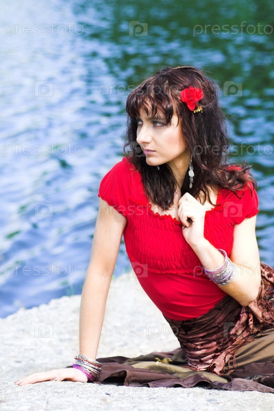 Девушка в красном сидит возле воды