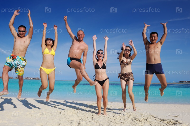 Группа счастливых молодых людей веселится на пляже