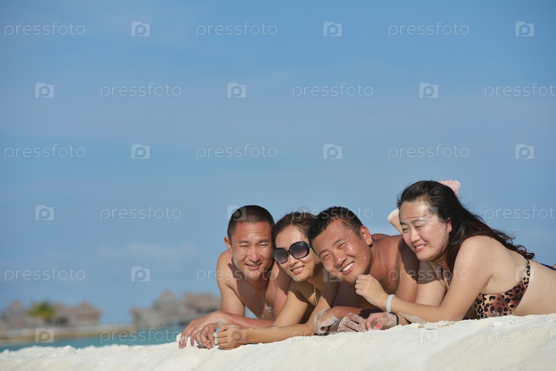 Группа счастливых молодых людей веселится на пляже
