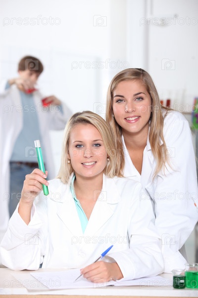 Студенты-химики с пробирками с зеленой жидкостью