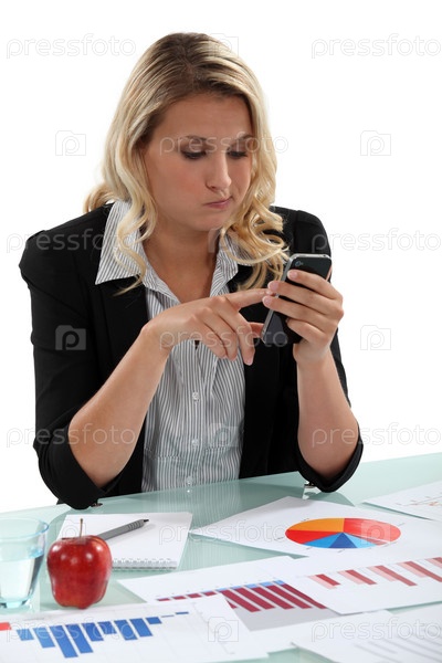 Блондинка с графиками на столе отправляет текстовое сообщение