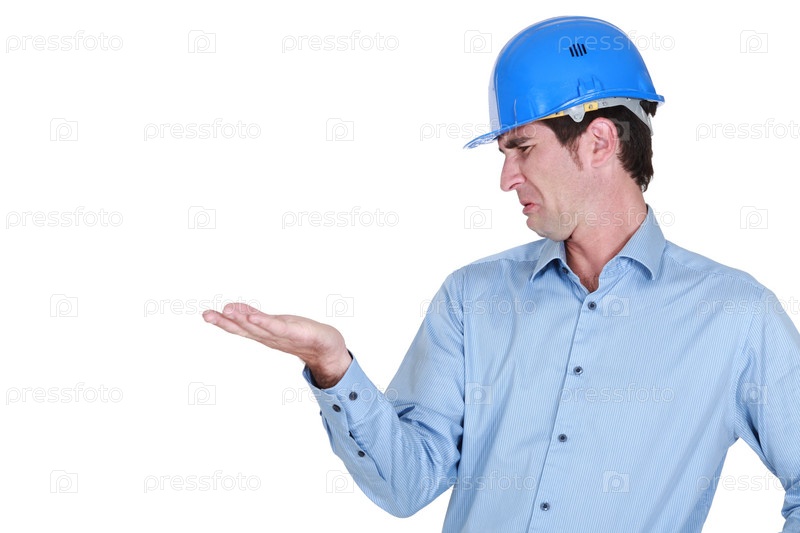 Мужчина в каске с отвращением смотрит на свою руку