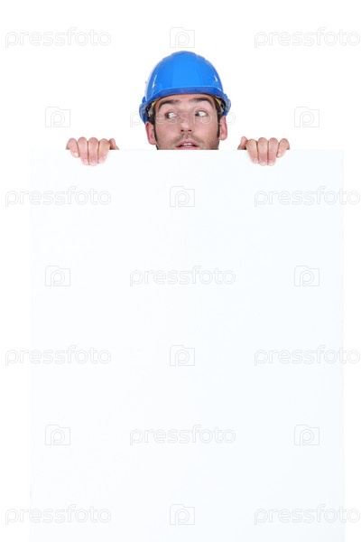Строительный рабочий прячется за плакат