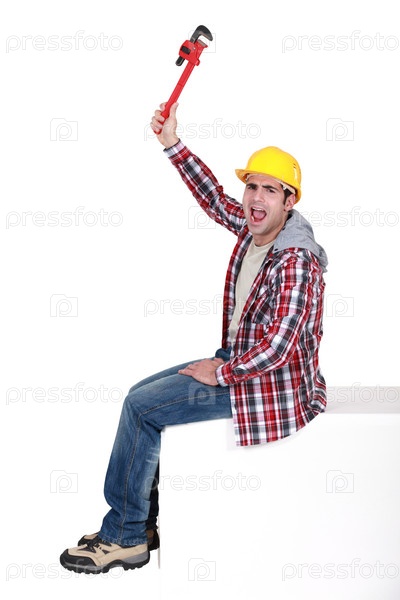 Сердитый рабочий держит гаечный ключ для труб