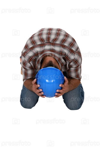 Рабочий закрывает голову, стоя на коленях
