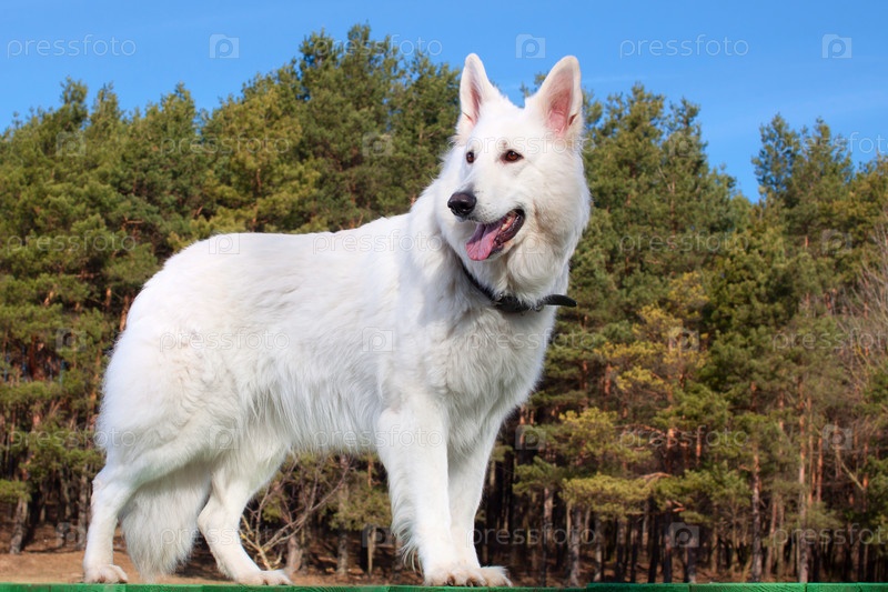 Швейцарская овчарка сидит на фоне леса