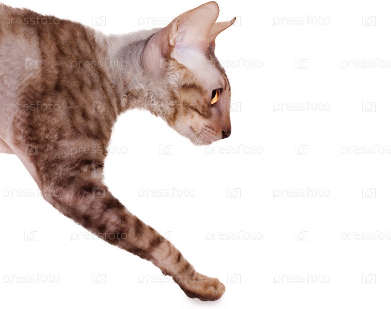 Голодный корниш-рекс идет на белом фоне