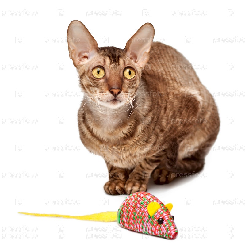 Кошка породы корниш рекс с игрушкой