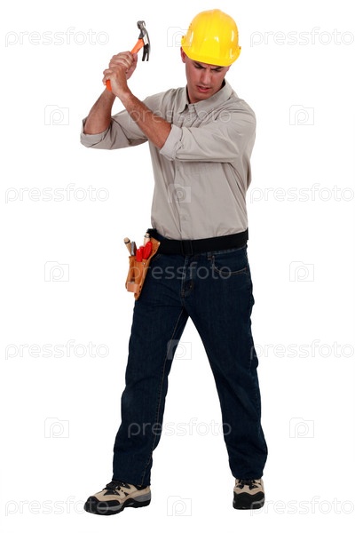 Рабочий ударяет молотком