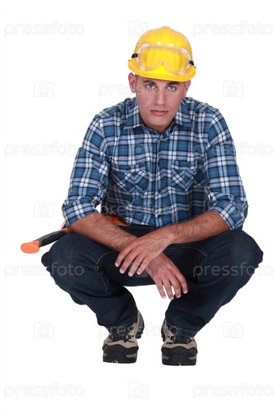 Рабочий с пронзительным взглядом сидит на корточках