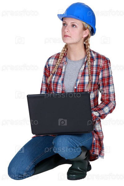 Светловолосая женщина-строитель стоит на коленях с ноутбуком
