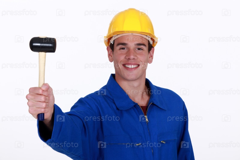 Восторженный молодой рабочий держит резиновый молоток