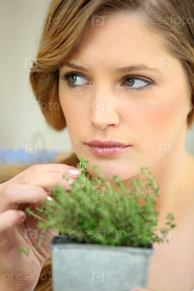 Молодая женщина срывает траву из горшка