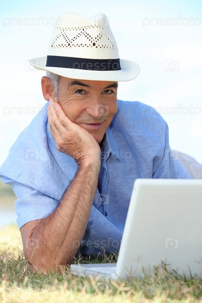 Пожилой мужчина использует портативный компьютер на берегу реки