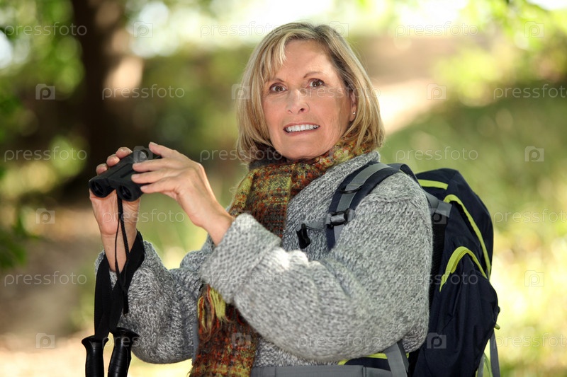 Русая пожилая женщина с биноклем