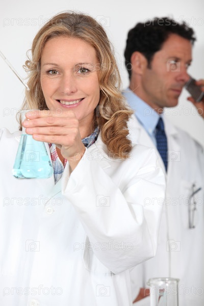 Лаборант тестирует жидкость, а ее коллега делает телефонный звонок