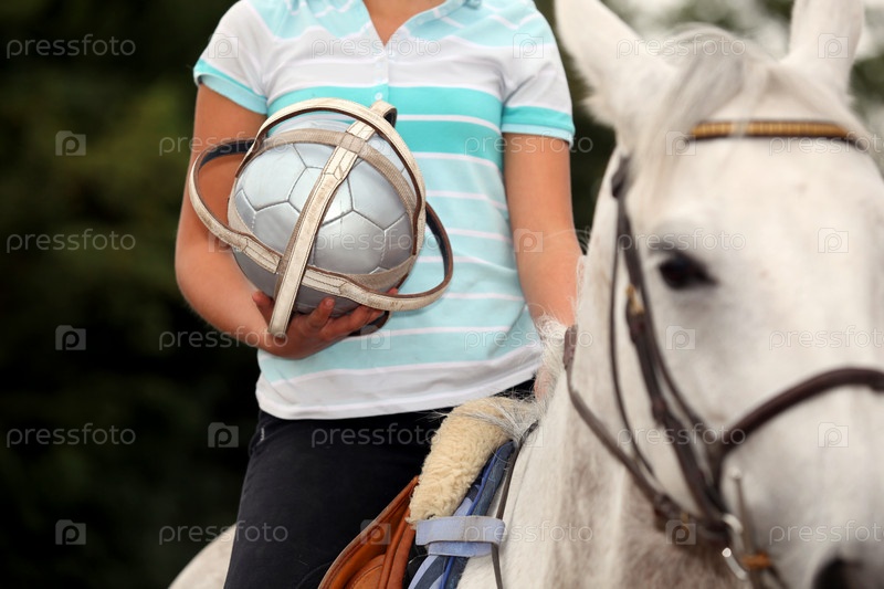 Женщина играет в мяч на лошади