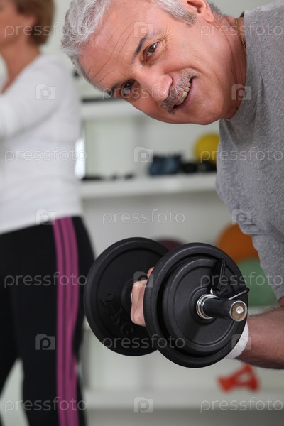 Улыбающийся пожилой мужчина поднимает гантель