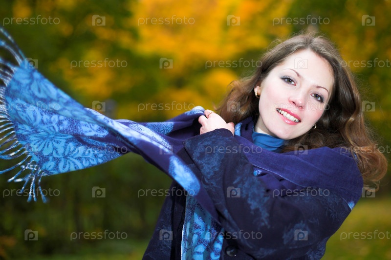 Портрет молодой женщины с шалом в осеннем лесу