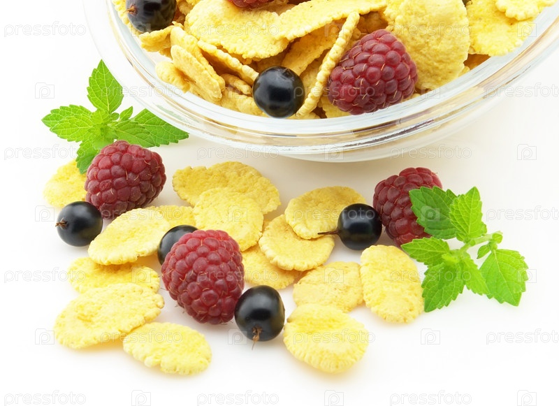 Хлопья с черной смородиной и малиной на белом фоне