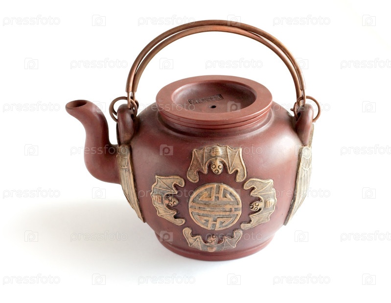 Традиционный китайский большой глиняный чайник с медными ручками на белом фоне