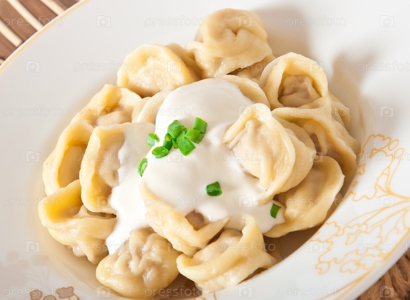 Русские пельмени со сметаной на тарелке
