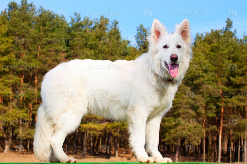 Швейцарская овчарка стоит на фоне леса