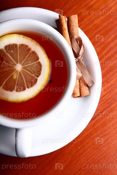 Чашка горячего чая на деревянном фоне