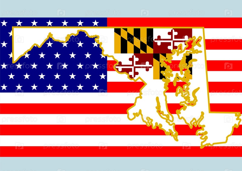 Контур и символика штата Мэриленд на фоне государственного флага США