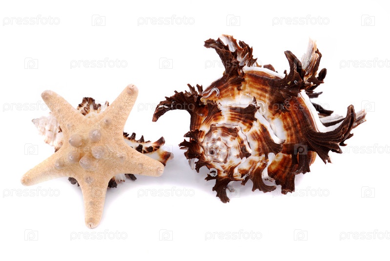 Морская звезда и ракушка, изолированная на белом фоне