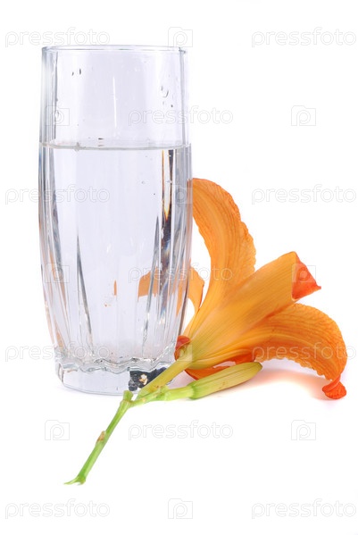 Цветок лилии рядом со стаканом прозрачной воды на белом фоне